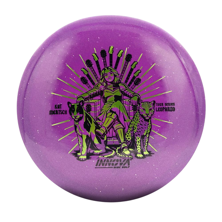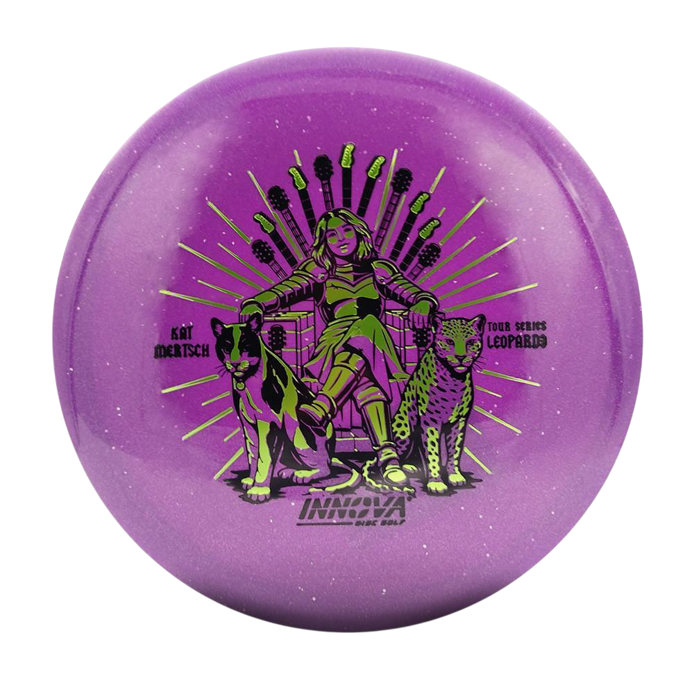 This Kat Mertsch Tour Series Metal Flake Star Leopard3 pairs the trusted Leopard3 flight with a premium plastic blend that adds durability and a slightly more stable feel. Players can throw it smooth for straight shots or power it up for controlled turnovers, giving it a wide range of uses across different skill levels. The Innova Kat Mertsch Metal Flake Star Leopard3 stands out as a dependable fairway driver that rewards clean releases and precise angle control.
